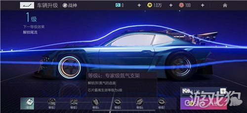 车手们可在车辆升级界面对爱车进行升级,根据赛车特技的不同,需消耗不同的零件,如狂野冲锋零件适用于战神,人车合一零件适用于禅等。车辆升级后,不仅整车性能会有所提升,还能解锁车辆特性,使其更为强悍,如战神达到等级2后,将加装空气动力学套件,可解锁尾流,达到等级4则将配备专家级氮气支架,解锁2阶氮气的选装等等。