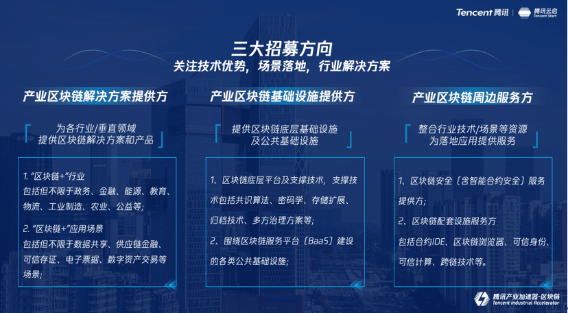 “腾讯产业加速器-区块链”将围绕三个方面进行招募:包括为各行各业垂直领域提供区块链解决方案和产品的产业区块链解决方案提供方;提供区块链底层基础设施、公共基础设施的产业区块链基础设施的提供方;整合行业的技术、场景等资源,为落地应用提供服务的区块链周边的服务方。