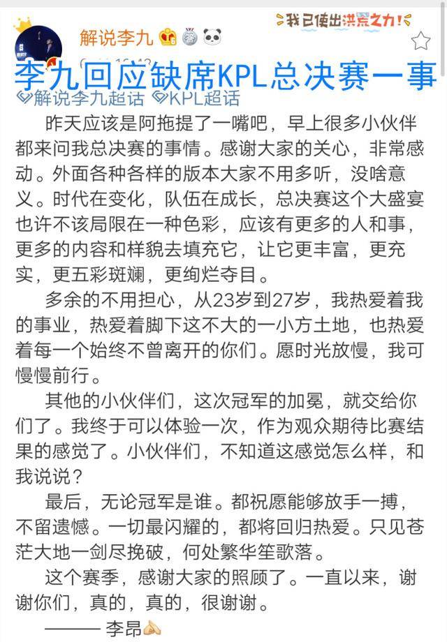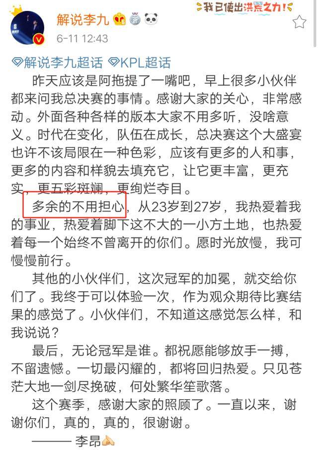 李九是不是真的要离开KPL?咱们其实可以从李九回应“无缘KPL总决赛”的发文中找到问题的答案。解说李九这一次发言中,说了一句非常关键的话,那就是“多余的不用担心”。这是什么意思呢?
