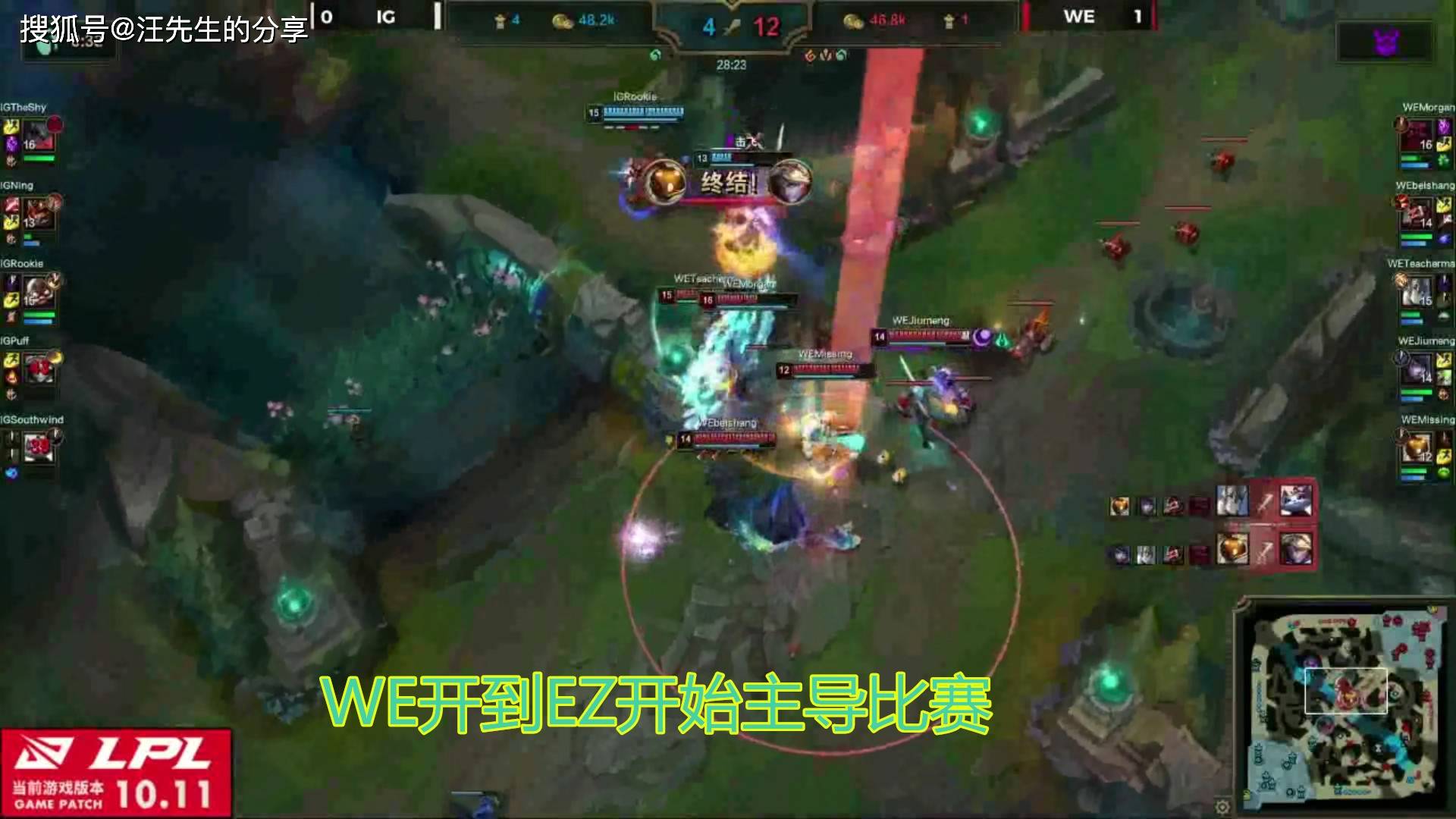 这场比赛打得还是比较的焦灼的,双方经济一直没有拉得非常的开,而且前期IG也是掌握着主动权,不过决定比赛走势的还是28分钟左右的一波中路团战,WE终于是找打机会开到EZ,杀掉IG三人,随后完成了双龙会,面对WE的推进Rookie的飞机和猫咪无力回天,可以说非常的“悲壮”,虽然今天IG输了,但是Rookie没有输。