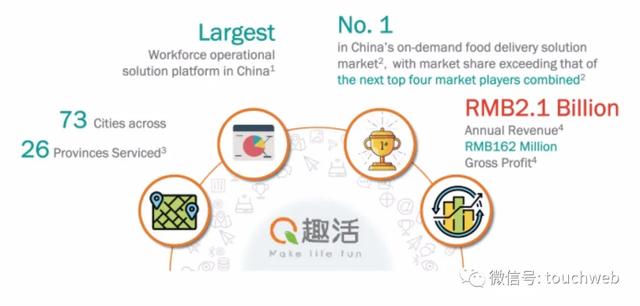 趣活业务主要涵盖:提供外卖按需送餐的解决方案、共享单车维护运营的解决方案、叫车出行的解决方案、管理解决方案和其他服务;其中提供外卖送餐解决方案是营收的绝对部分。食品即时配送是趣活最主要的收入来源。