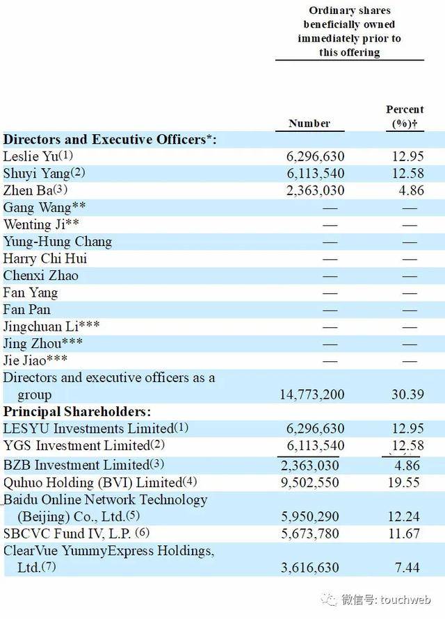 IPO前,俞阳(Leslie Yu)持股为12.95%;杨树轶持股为12.58%;Zhen Ba持股为4.86%;Quhuo Holding (BVI) Limited持股为19.55%。