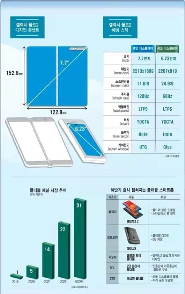 配置上,爆料称,三星Galaxy Fold 2的内屏和外屏都有较大升级,内屏大小为7.7英寸,分辨率为2213×1689,纵横比为11.8:9,采用LTPS屏幕,刷新率高达120Hz,并且覆盖有UTG玻璃,可以提升手机屏幕的强度和柔韧性,使其更加耐用。
