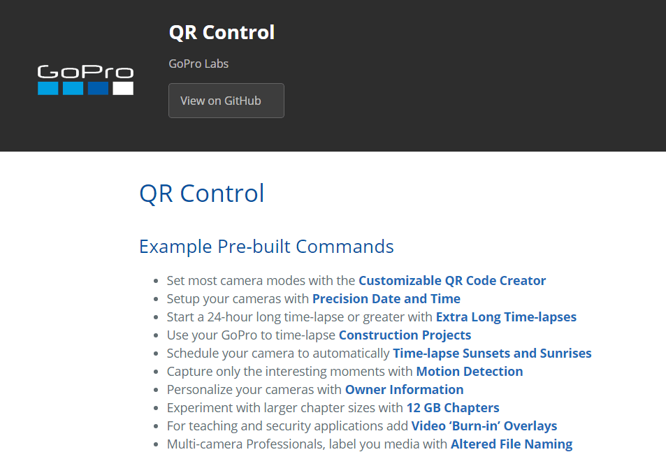 GoPro官方开发了一种能够以二维码来控制 GoPro HERO8 的功能。如果用户对于拍摄时间有精准的要求或需要拍摄耗电量较大的内容,例如横跨多日甚至多周的项目,或者遥距操控超出WiFi可控制的距离,自定义的二维码均可满足这些需求。用户只需要将摄像机对准自定义的二维码,即可触发预设功能。