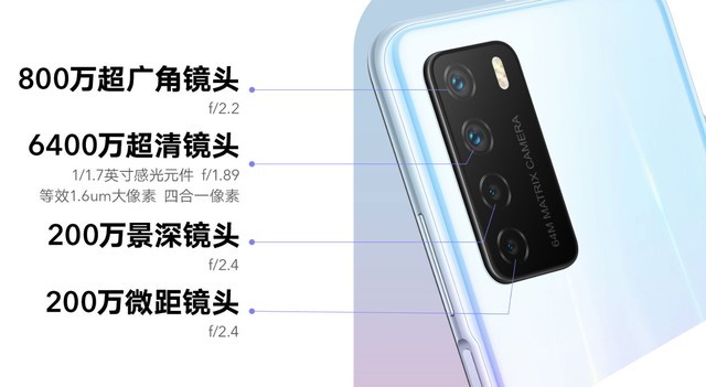 荣耀 Play4的后置摄像头模组共有四颗摄像头组成,分别是6400万像素主摄+800万像素防畸变广角镜头+200万像素微距镜头+200万像素景深镜头。