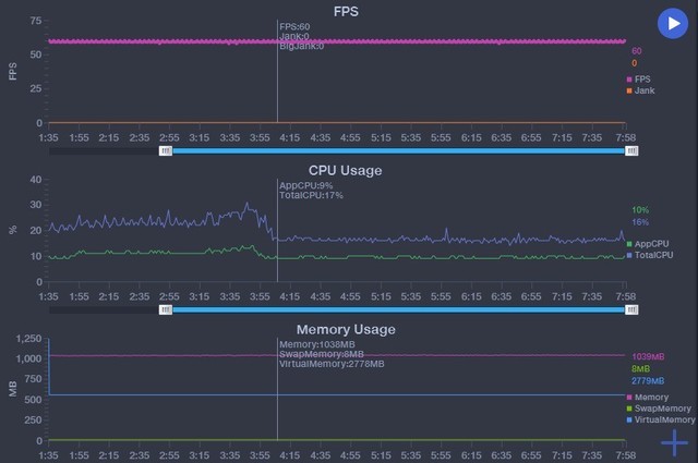 通过PerfDog记录的数据我们可以看到荣耀 Play4在游戏全程都保持了60帧的满帧率运行状态,帧率曲线的波动范围在1帧以内,由此可见荣耀 Play4以满帧状态畅玩运行《王者荣耀》可谓是毫无压力。
