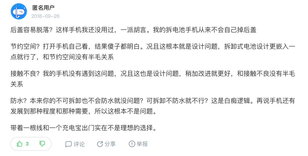 有网友认为:可拆卸电池只是更嵌入一点,并没有多大关系。