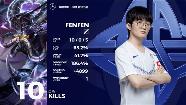 本局比赛MVP给到了ES中单选手Fenfen的卡萨丁!