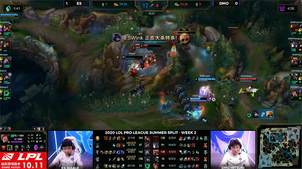 比赛来到27分钟,ES推掉DMO中路高地塔和上路高地塔,随后双方在DMO门牙塔处发生5V5团战,最终ES仅用了一个猴子的代价团灭了DMO(卡萨丁三杀)并推掉DMO基地,赢下比赛胜利!ES拿到夏季赛首胜!