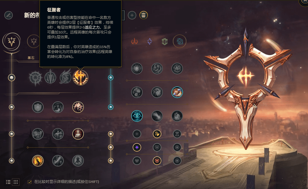 基石符文毫无疑问仍旧是征服者,接下来就是气定神闲+血统,提升法力值以及吸血能力,都是为了加强EZ的拉扯能力,最后一栏致命一击与砍倒可以抉择,脆皮多选择致命一击,前排多则是砍倒;副系方面选择启迪的饼干配送+星界洞悉,攻速+适应之力+护甲,同样是为了加强一个AD方面的对拼能力!