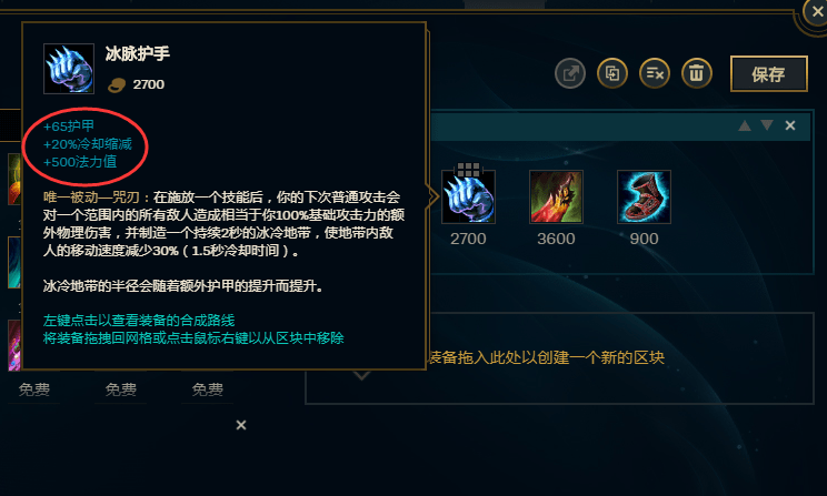冰拳:65护甲,20%冷却缩减,500法力值;