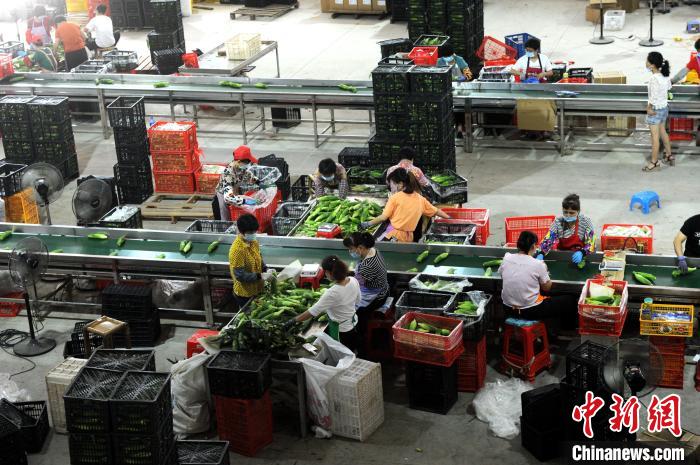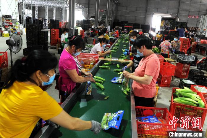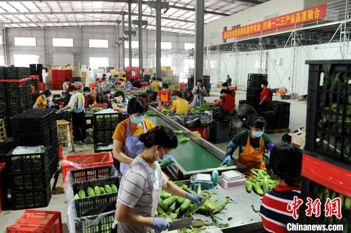 工人们进行分拣包装“水果玉米”。 张金川 摄走进韩珠卿创办的星翌(福建)供应链管理有限公司内,发现工人繁忙有序,上万根“水果玉米”滚动在初加工流水线上,正由工人们进行分拣包装。