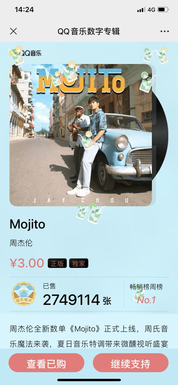 截止12日下午14时,腾讯音乐旗下三大平台售出300万张《mojito》,并且这一数字仍在持续增长中。