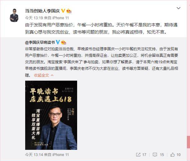原标题:李国庆回应“午餐拍卖价超出10亿元”:有用户恶意抬价,午餐将重拍