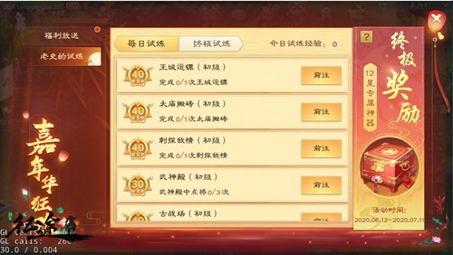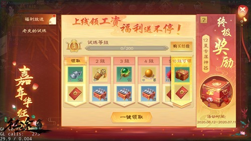 完成每日活动,不仅能得到家族积分,还能完成限时挑战。6月12日至7月11日,游戏中将限时开放“老史的试炼”玩法。通过运镖、古战场、武神殿等玩法,玩家将得到数量不等的试炼经验,升级试炼等级,解锁丰厚奖励!不止有大量银两、押镖令、升级宝石放送,还有高级天魔石、冲穴丹、12星人物装备等你来领取!