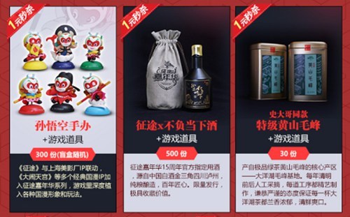本次嘉年华最有看点的,莫过于包括《绿色征途》手游在内的全系列《征途》游戏共同举办,由征途超级大哥团带队的直播带货互动。今晚19点,将在快手直播(快手搜索:征途嘉年华)开启“1元秒杀千件实物+道具”活动,为广大征途玩家送去开幕福利!直播为大家带来:征途嘉年华指定用酒“不负当下酒”、史大哥同款特级黄山毛峰、美影厂正版《大闹天宫》盲盒、收藏级名家紫砂壶在内的诸多珍品!而且这一切都只要“1元秒杀”,简直白给,福利放送!
