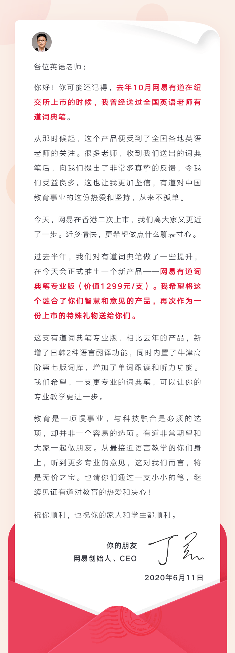 2019 年 10 月,在网易有道赴纽交所上市时,丁磊为全国英语教师送上了网易有道词典笔;今天上午,在网易香港二次上市的同时,丁磊又发表公开信,向英语教师们赠送升级了词库、日韩语翻译与单词跟读等功能的有道词典笔专业版作为「上市的特殊礼物」。