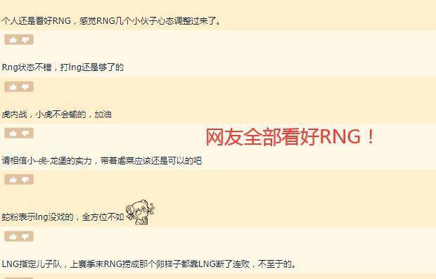 今天即将迎来RNG与LNG的对局,在这夏季赛里RNG的表现还是相当可以的,至少现在是积分第一的队伍!从前两场RNG的比赛里我们都有看到队员们状态都有所回升了,不像在春季赛时那么拉胯。而这次面对LNG能赢的概率有多大,网友们表示这次RNG想赢得靠小虎和小龙堡这对龙虎兄弟了!