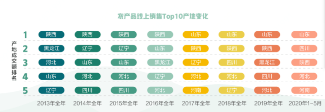 近3年,山东、四川、河南、江西、安徽产地的农产品线上成交额的排名上升。