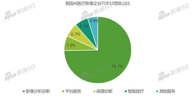 从我国AI医疗影像企业TOP 10营收占比可以看出,AI赋能医联网主要体现在影像分析诊断应用,占比高达74.7%,平台服务应用占比为7.2%,病理诊断服务占比为6.7%,智能放疗服务占比 为6.5%,其他服务占比为4.9%