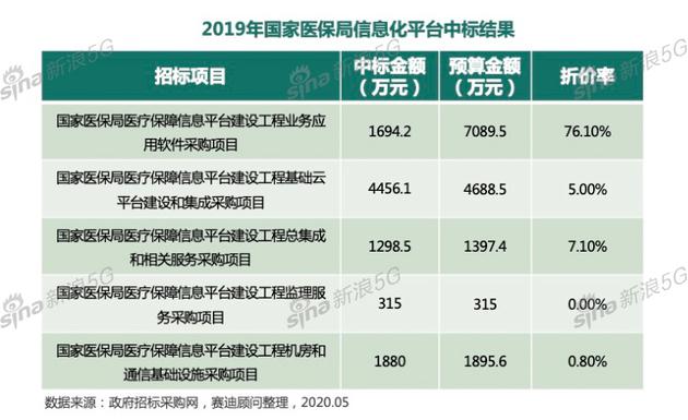 数据显示,2019年国家医保局就医疗保障信息平台建设工程开展了5次招标,中标金额总计为9643.8万元,预算金额总计为15386.0万元。