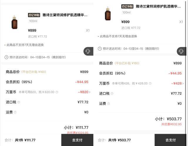 以汪女士获得820元返现来计算,最早购买某品牌精华可全部抵扣820元,仅需花费111元;规则调整后,一单只能抵扣428元,买同样的一瓶精华需要多花近400元,且为了花掉剩下的400元抵扣券,还需要再购买总额为800元的物品。