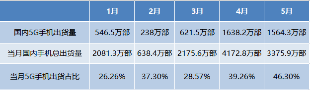 整体来看,今年1-5月,国内市场5G手机累计出货量4608.4万部、上市新机型累计81款,占比分别为37.0%和47.9%。