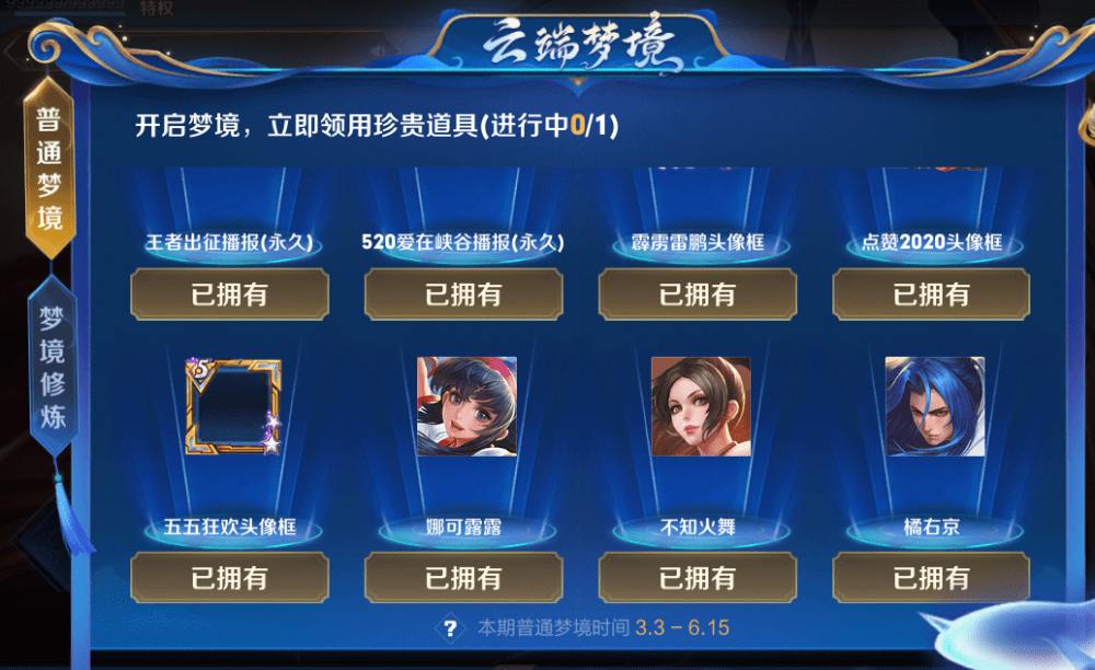 游戏内的普通云端梦境已开启三个多月,其中除了多款头像框和荣耀播报特效外,最主要的是娜可露露、不知火舞、橘右京三位SNK英雄都可免费获得,只要坚持参与活动就能成功集齐这三位英雄,本期的普通梦境将于6月15日结束,还未集齐他们的玩家要抓紧时间了哦!错过这次机会,三位英雄又将会成为绝版英雄。