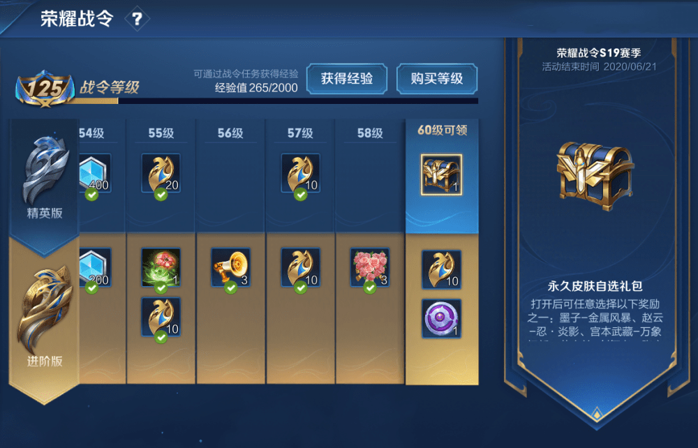 S19赛季的战令也提供了丰富的奖励,其中无需点券进阶也能领到永久英雄和皮肤,每周通过完成战令任务就能升级,分别在30级和60级时可领取永久英雄六选一礼包、永久皮肤六选一礼包。打开可领取刘备、阿轲、黄忠等热门英雄,还能获得墨子、花木兰、宫本武藏等英雄的勇者皮肤,拿到英雄皮肤礼包的同时还能获得大量战令币,可在战令系统中兑换各种好礼。
