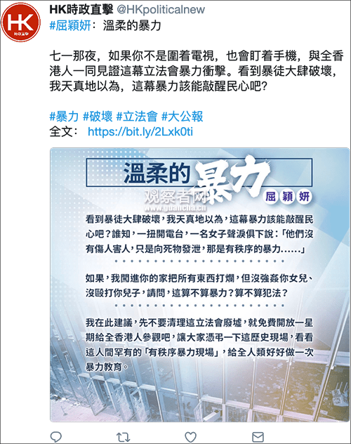 但推特声明给出的示例显示,这些所谓破坏香港暴乱“合理性”的信息,全都是痛斥暴徒暴力行为,力挺香港警察的内容。