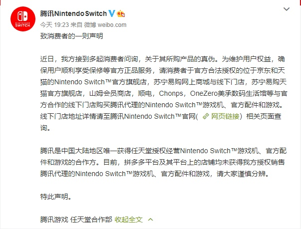 今天上午,任天堂Switch国内代理腾讯NintendoSwitch官方发布声明,称只有在自营平台购买的产品才能保证是正品,而没有和线上的拼多多平台,及其上面的店铺有任何官方合作。