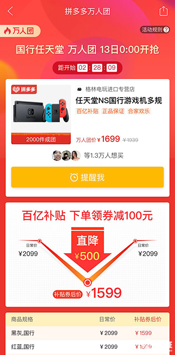 同样的任天堂Switch游戏机,拼多多百亿补贴+正品保证+万人拼团的组合新玩法,让这款标价2099元的游戏机直接打了76折,你说香不香?
