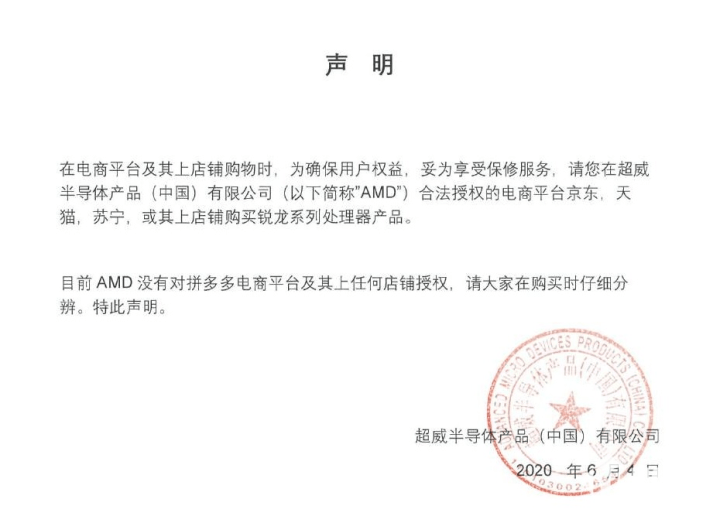6月初,知名PC芯片厂商AMD中国公司官方发布声明,称旗下的合法线上售卖渠道只有京东、天猫、苏宁等,同时表示没有和拼多多,以及上面的店铺有任何直接形式的合作。