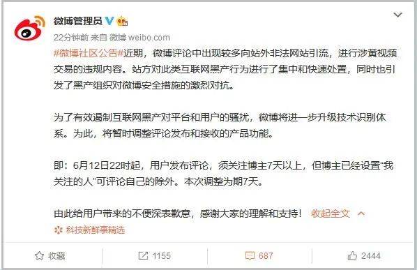 即:6月12日22时起,用户发布评论,须关注博主7天以上,但博主已经设置“我关注的人”可评论自己的除外。本次调整为期7天。