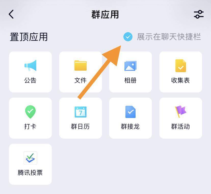 点击「展示在聊天快捷栏」后,你会发现群应用都出现在对话框的上方了。