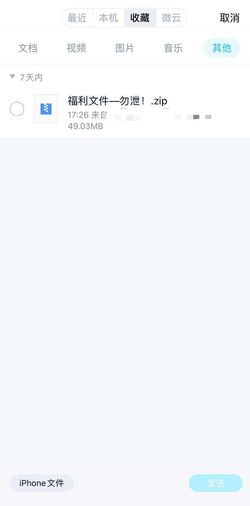 更新到8.3.9后,小雷发现现在发送文件界面,可以选择「收藏」里面的文件,就能直接发送了。