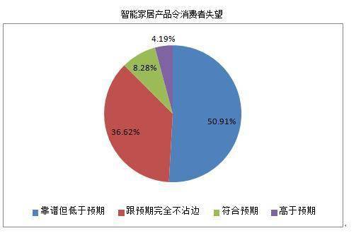 智研咨询集团发布的《2016-2022年中国智能家居行业市场现状分析及投资前景预测报告》显示, 如今的智能家居产品普遍令消费者感到失望,约有50%的消费者认为智能家居靠谱但低于预期,仅12.47%的消费者表示智能家居产品符合预期或高于预期, 还有36.62%的消费者表示,智能家居产品跟预期的完全不沾边。