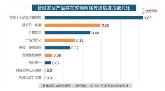 据新浪舆情通大数据分析显示, 个人隐私泄露成为智能家居产品被诟病最多的弊端。此外,缺乏统一标准、价格昂贵、产品同质化以及安装、使用复杂等都成为了智能家居产品的主要痛点。