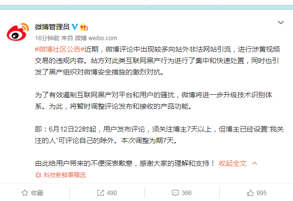 为此,将暂时调整评论发布和接收的产品功能。即:6月12日22时起,用户发布评论,须关注博主7天以上,但博主已经设置“我关注的人”可评论自己的除外。本次调整为期7天。