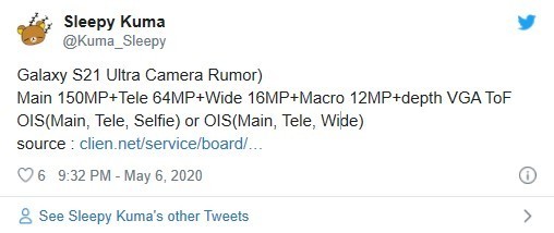 近日国外技术论坛 Clien上出现一桩爆料,爆料中分享了预计在2021年上半年发表的三星旗舰级手机Galaxy S21(暂定名称)的相机规格。爆料者指出,三星Galaxy S21最高规格版本预计搭载1.5亿像素的主镜头,再搭配6400万长焦镜头、1600万像素超广角镜头、1200万像素微距镜头,以及可感知深度的3D ToF镜头,背面总共5颗镜头,规格亮眼。