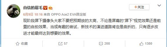 前OPPO全球营销总裁沈义人此前在微博上表示,现阶段屏下摄像头大家不要把预期放的太高,不论是屏幕的“屏下”视觉效果还是前置的自拍效果,当成有趣的尝试,新技术的演进道路肯定是曲折的,只有逐步改进才能最终达到想要的效果。到底哪一款手机能率先采用这项技术,并且实现量产,成像质量也能符合消费者期待,这也是令人期待的一件事。