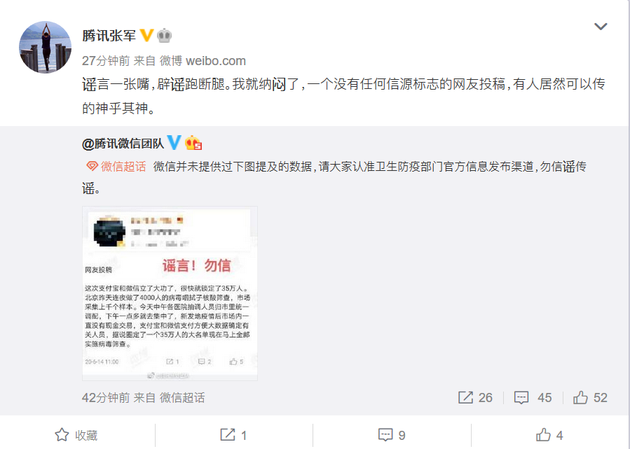 腾讯公司公关总监张军称,“谣言一张嘴,辟谣跑断腿。我就纳闷了,一个没有任何信源标志的网友投稿,有人居然可以传的神乎其神。 ”