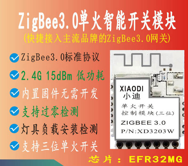 2.2)控制软件(固件集成):采用Zigbee3.0标准协议栈及成熟单火开关优化算法,性能稳定功耗低。 迅迪电子采用Silicon Labs EFR32MG21芯片模块开发的ZigBee单火线开关控制模块是一款嵌入式Zigbee无线通讯模块,支持Zigbee3.0标准亦可向后兼容,具有业内优越的RF性能。