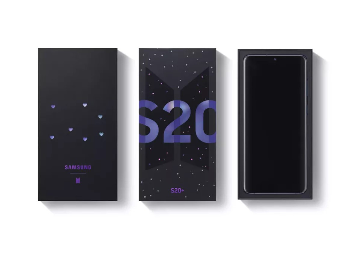 Galaxy 20+ BTS 特别版采用紫色的机身配色,机身背面下方有专属的 BTS Logo,相机模组上还印有一颗紫色的爱心标志,手机内置的锁屏、壁纸、桌面主题以及手机包装盒自然也是做了定制,此外包装内还内附了 BTS 成员的卡片。