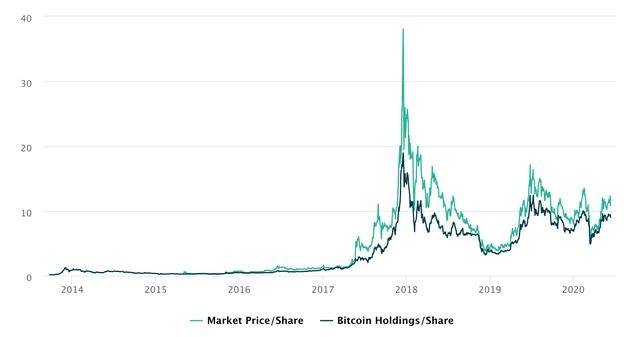 从历史看,灰度信托股价的溢价情况一直存在(绿线为信托股价,黑线为每股对应比特币价值)