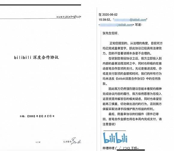 在邮件中,B站表示“此协议已经具有法律效力,您的不签署说明本身是不合理的。”