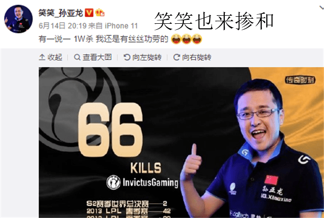 还有一个人亲自站出来,证明自己应该有一份功劳,他就是IG的前队员笑笑孙亚龙。笑笑在战队中的时候,表现并不是很突出,不少人嘲笑他的时候说,他没有在演,只是真的菜。这一次笑笑告诉大家,这一万个当中,有66个是算在了他的头上。