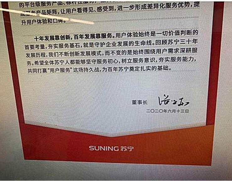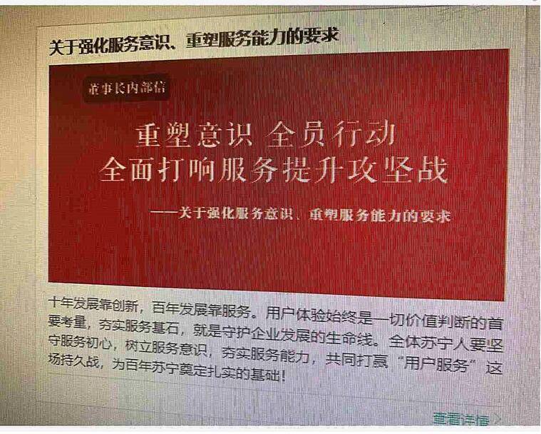随着618大促的临近,一封苏宁内部信流出。信中,苏宁控股集团董事长张近东要求苏宁全员强化服务意识、夯实服务能力。张近东表示:“十年发展靠创新,百年发展靠服务。用户体验始终是苏宁一切价值判断的首要考量,苏宁三十年间不断创新发展模式,而不变的是始终围绕用户需求深耕服务。”