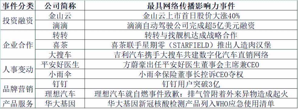 统计各细分行业头部创业公司最具网络传播影响力事件共计10个,企业合作类事件各占30%,投资融资类事件占20%,人事变动类事件占20%,品牌营销类占20%,产品服务类占10%。金山云上市首日股价大涨40%、转转与找靓机达成战略合作、理想汽车就自燃事件致歉:排气管附着外来异物造成起火成为最受媒体关注的三个事件。
