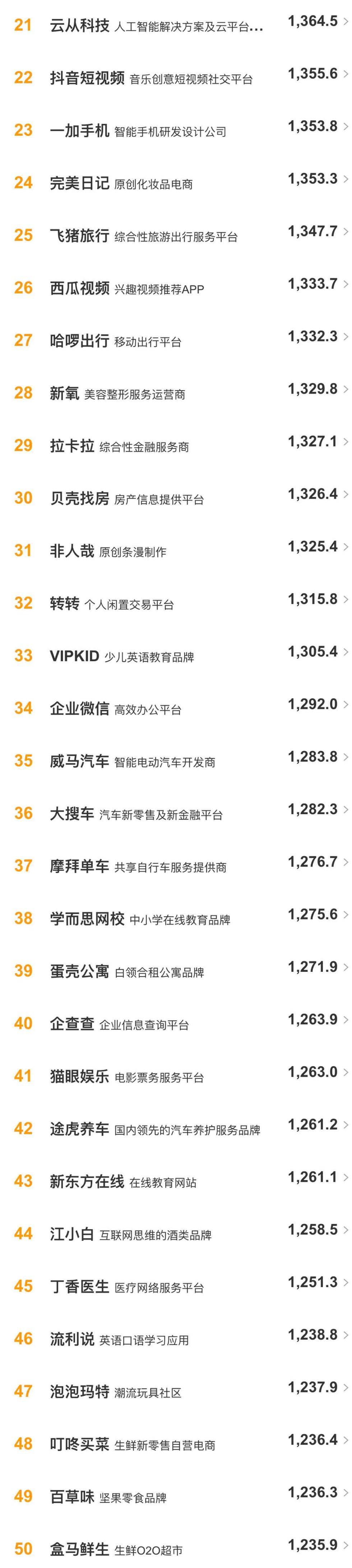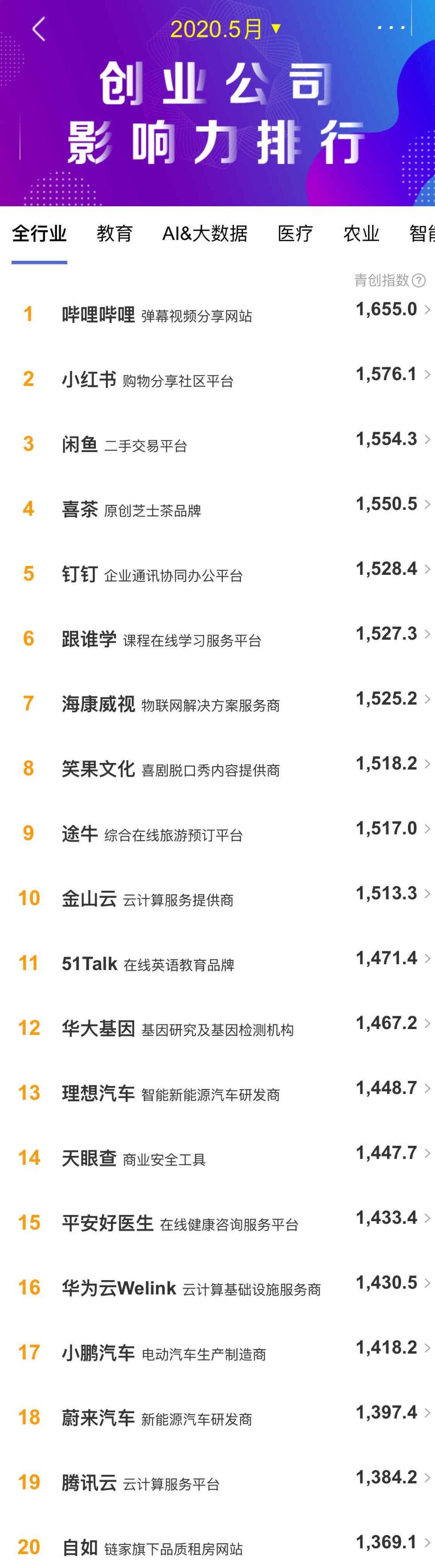 5月创业公司传播影响力TOP100中,哔哩哔哩综合排名第一,小红书、闲鱼、喜茶、钉钉、跟谁学、海康威视、笑果文化、途牛、金山云跻身前十。较4月份相比,哔哩哔哩由第四名上升至第一名,钉钉由由第六名上升至第五名,海康威视由第九名上升至第七名,途牛由第十九名上升至第九名,金山云由三十七名上升至第十名。